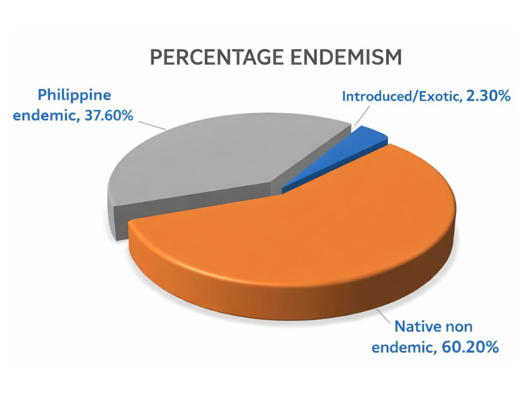 • 80 espèces (60,20 %) ont été identifiées comme indigènes non endémiques, ou espèces indigènes des Philippines présentes également dans les pays voisins